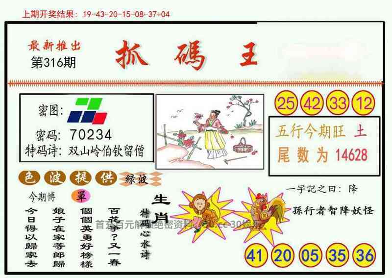 【精解抓码王】开(發00) 316期:双山岭伯钦留僧 【主攻抓肖】羊鸡龙马牛虎蛇兔猪 【抓码尾数】12468 【抓码双波】红蓝波 【主攻抓码】11.23.21.02.12.05.04.13.03.07 |
